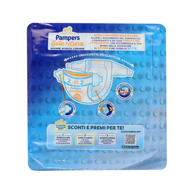 Pampers Sole & Luna è il pannolino economico, pratico e indispensabile che assicura tutta la protezione asciutta di Pampers e si prende cura delicatamente della pelle del tuo bambino. Questo grazie al rivoluzionario sistema "Fresco-Asciutto" e alla speciale lozione con estratti di Aloe che aiuta a proteggere la pelle del tuo bambino da arrossamenti e irritazioni.